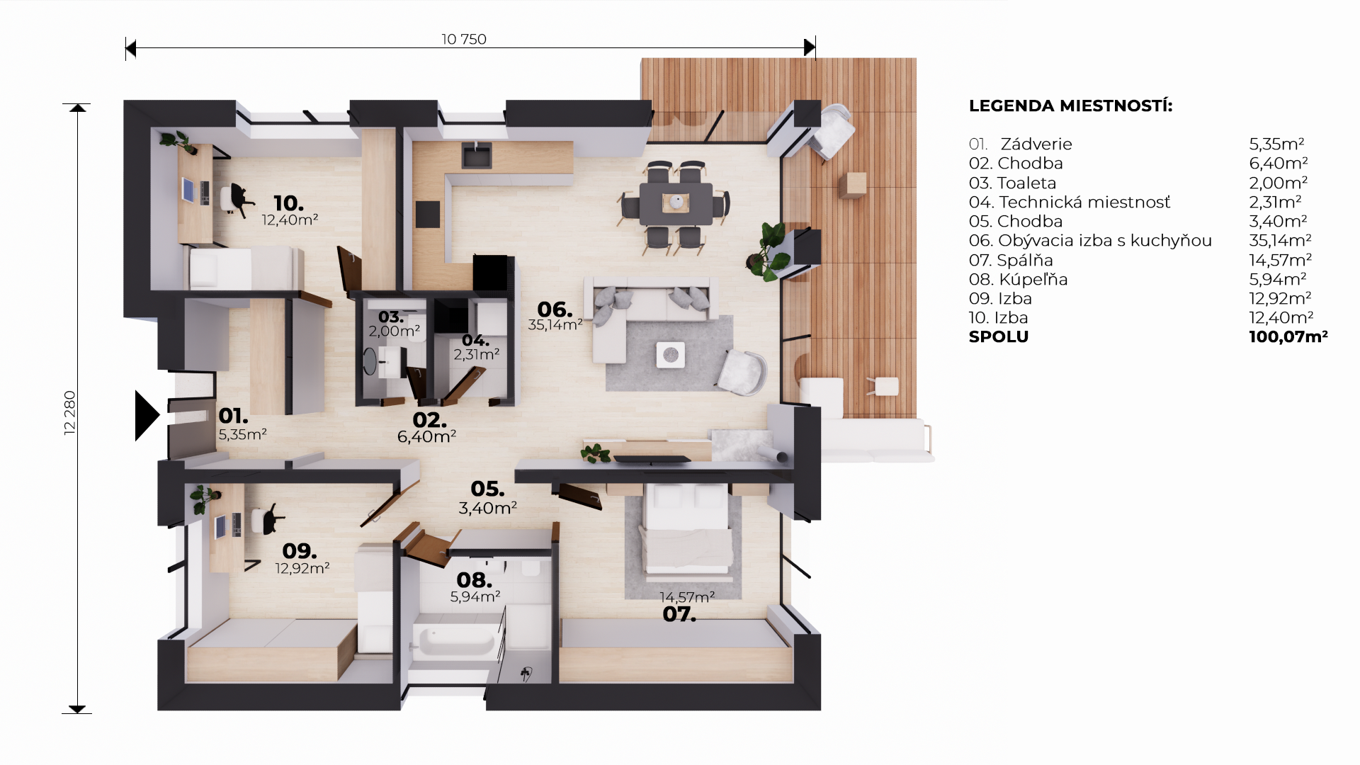 Bungalov JARMILA je moderný jednopodlažný rodinný dom s celkovou rozlohou 100,07 m². Jeho dispozícia je prakticky a efektívne rozvrhnutá tak, aby poskytovala komfortné bývanie pre celú rodinu. Exteriér bungalovu je moderný a minimalistický. Predná časť domu má elegantný vstup a zadná časť domu ponúka priamy vstup na terasu, ktorá je ideálnym miestom na oddych.