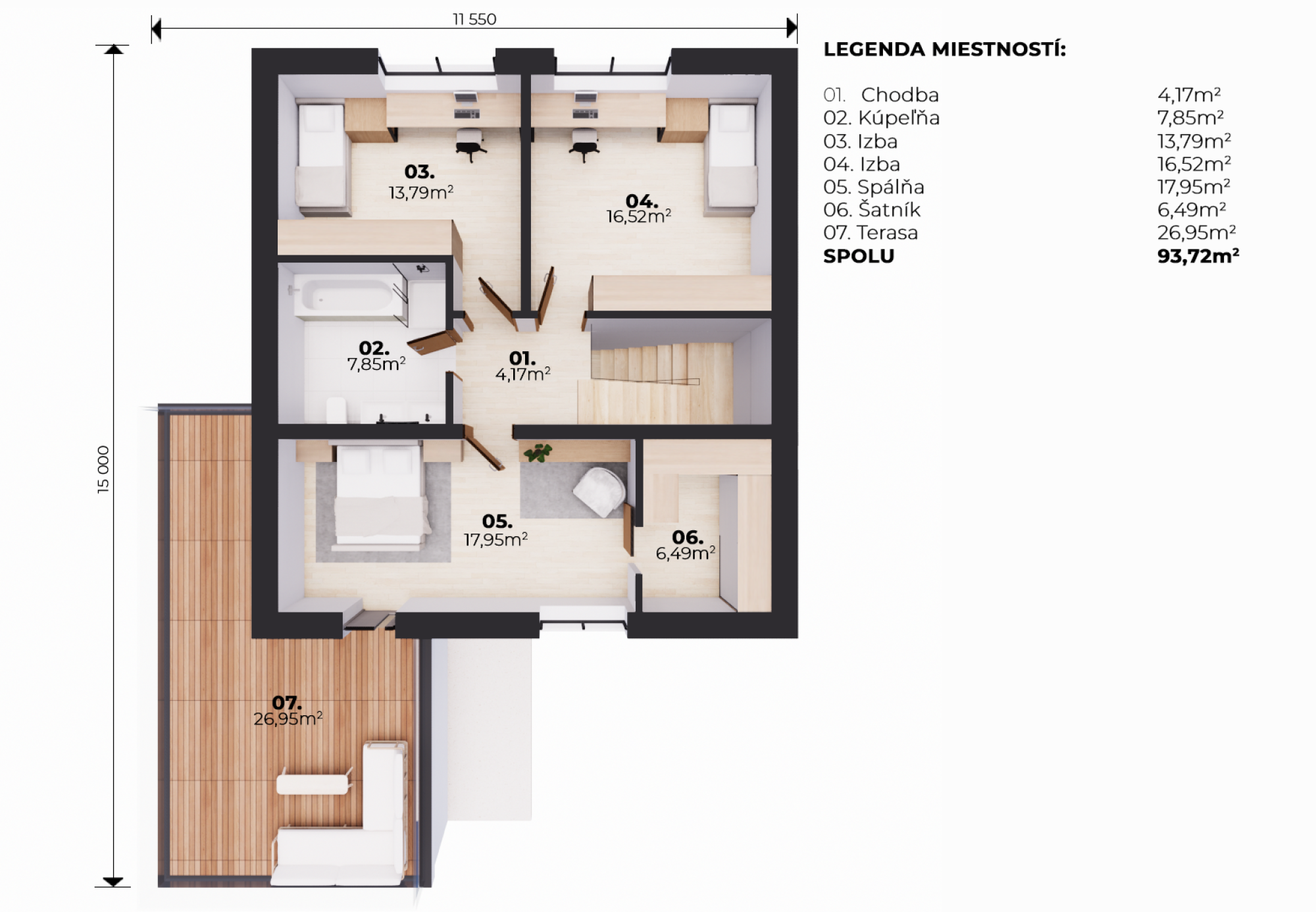 Denná a nočná časť poschodového projektu domu je rozdelená poschodiami. Denná sa nachádza na prízemí a disponuje miestnosťami, akými sú pracovňa, menšia kúpeľňa s WC, špajza, priestranná kuchyňa spojená s obývacou izbou. Z tejto centrálnej časti domu vedie vstup do zadnej záhrady. Nočná časť projektu domu sa rozprestiera na poschodí. Tu sa nachádza rozľahlá spálňa s vlastným šatníkom, dve detské izby a kúpeľňa. Projekt domu v tvare L ZOJA zahŕňa na poschodí vlastnú terasu, pod ktorou je strategicky ukrytá garáž pre 1 automobil.