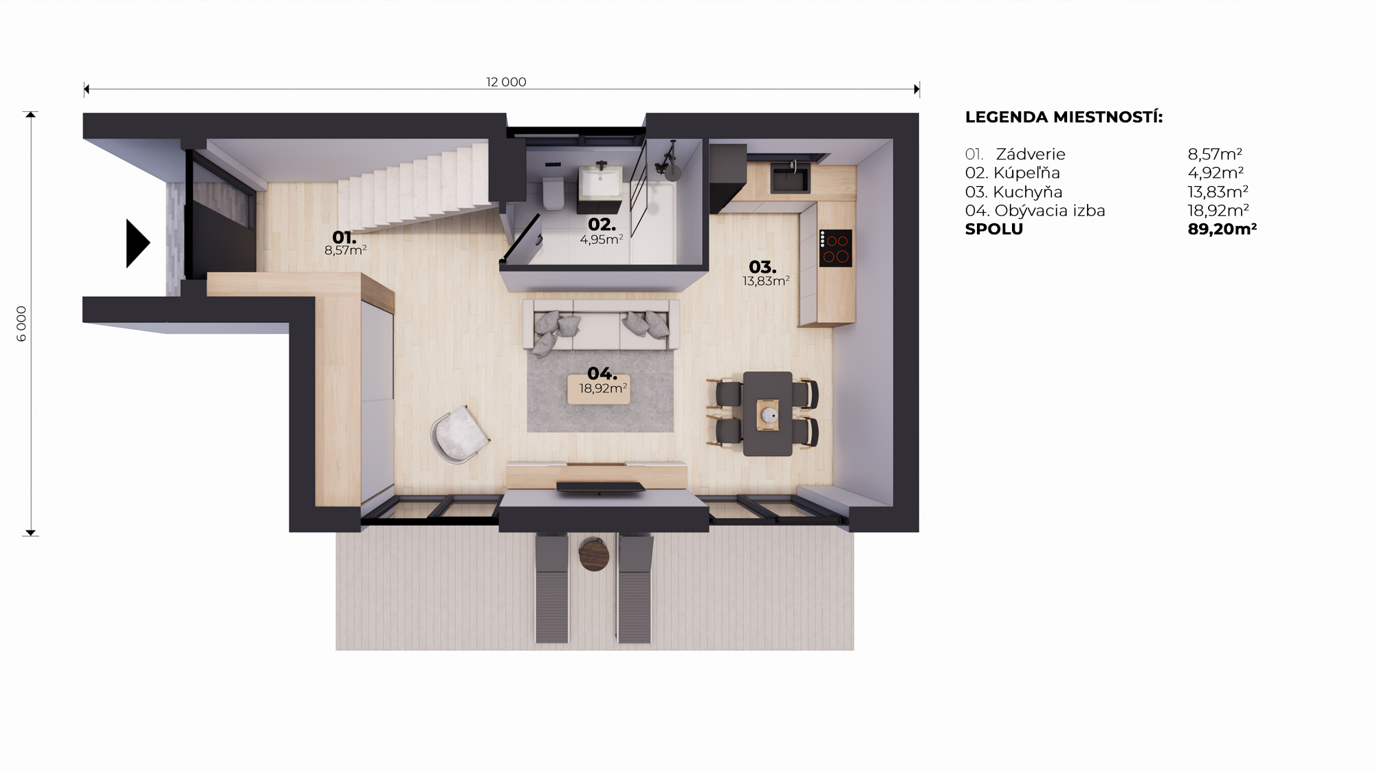 Z dennej časti vedie výstup na terasu, ktorá ponúka ideálny priestor na vychutnanie si kávy, oddych alebo letné opaľovanie na lehátku.