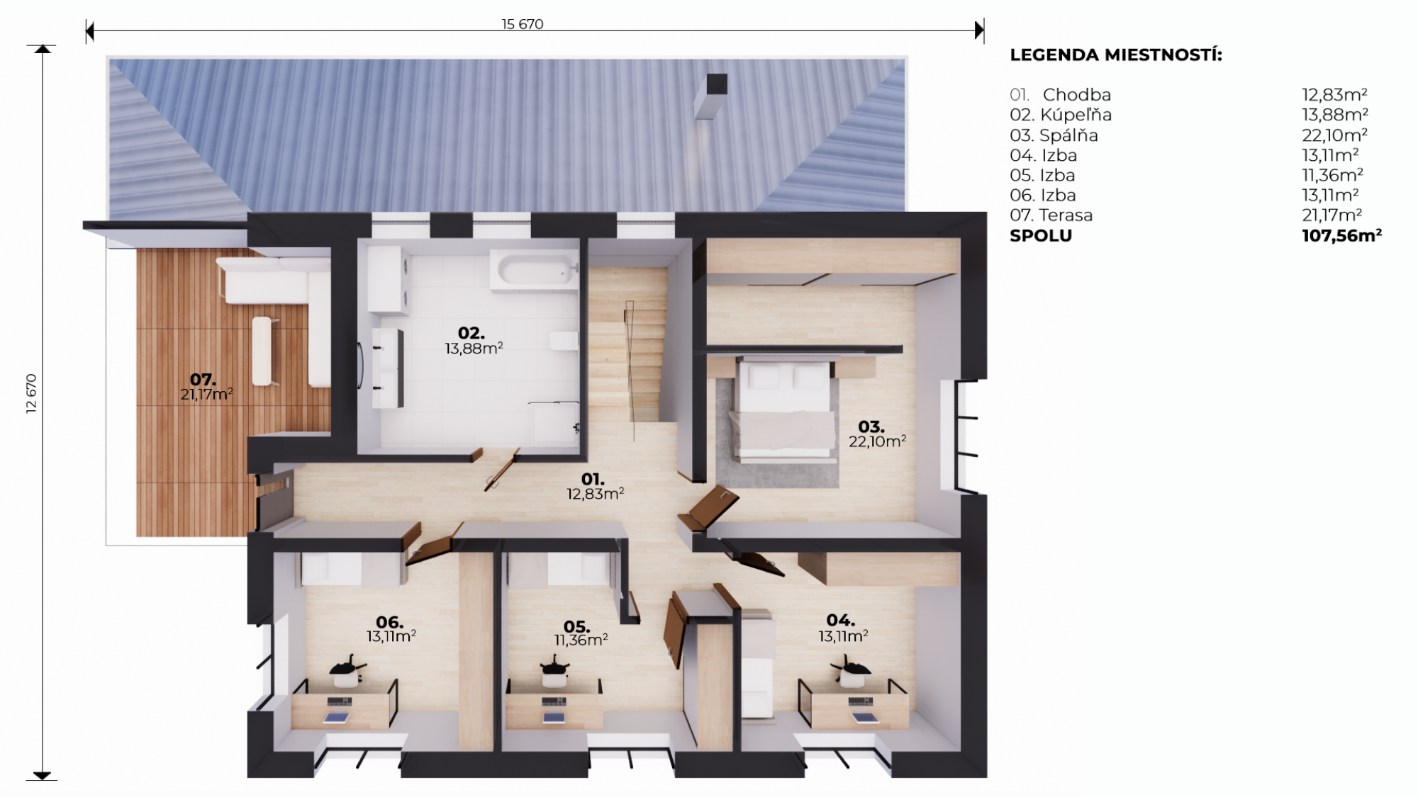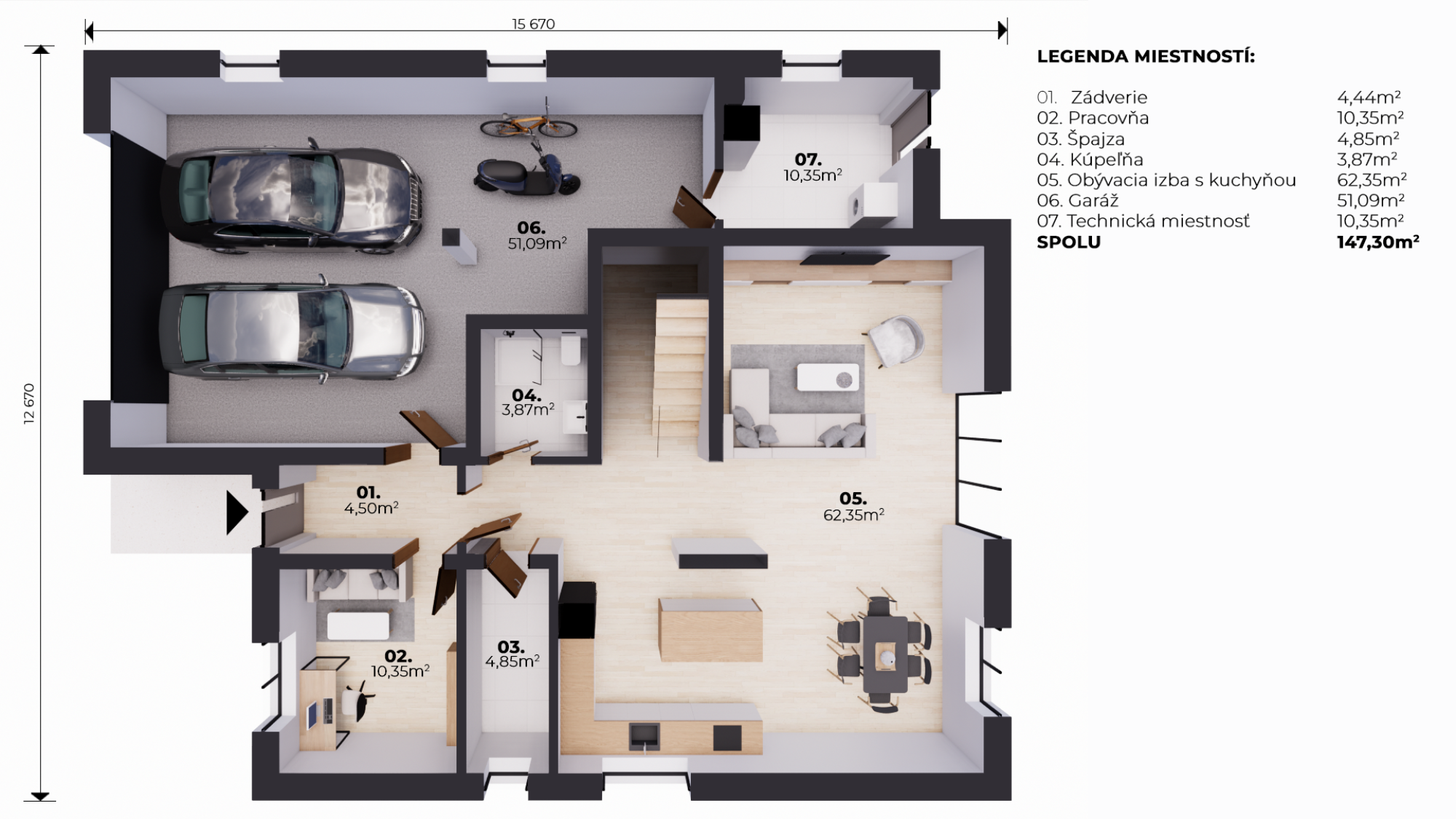 Na prízemí dominuje spojená obývačka s kuchyňou, barovým pultom a jedálňou. Taktiež sa tu nachádza špajza, menšia kúpeľňa, technická miestnosť a pracovňa, ktorá môže slúžiť aj ako hosťovská izba. V projekte domu je na poschodí spálňa pre rodičov s vlastným WC. Okrem toho sú tu tri detské izby, práčovňa, kúpeľňa a terasa. Súčasťou projektu domu je aj garáž, ktorá ponúka pohodlné parkovanie pre dva osobné automobily.