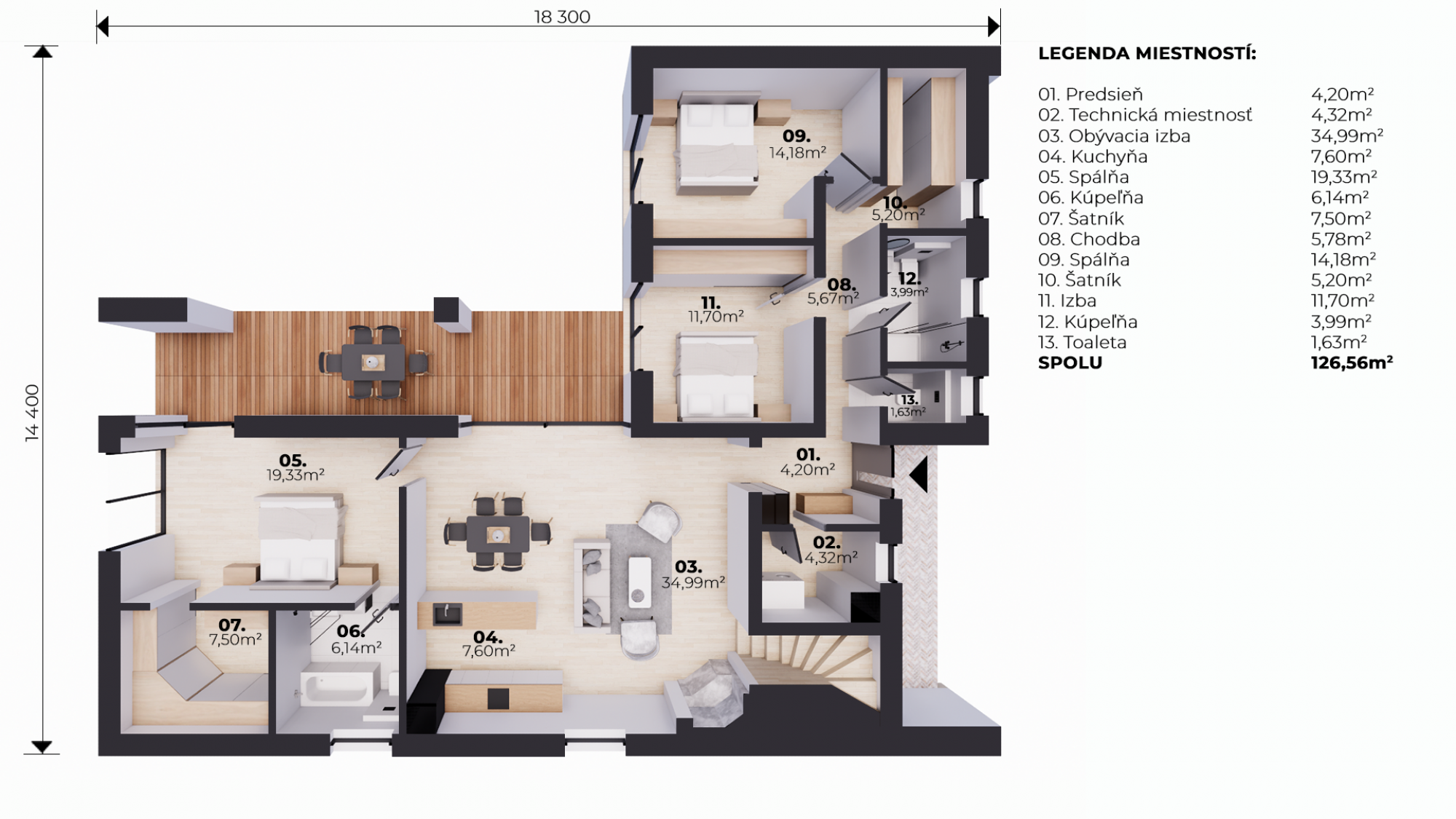 Centrálna časť projektu domu zahŕňa obývačku spojenú s kuchyňou a jedálňou. Dokonalú rodinnú atmosféru umocňuje vhodne umiestnený krb. Okrem toho sa tu nachádza spálňa pre rodičov s vlastnou kúpeľňou a šatníkom. V druhej časti domu sú dve detské izby, samostatný šatník, kúpeľňa, technická miestnosť a WC. Obývačka a spálne sú v projekte poschodového rodinné domu vybavené priamym vstupom na priestrannú terasu, ktorá je čiastočne krytá. Na poschodí sa nachádza miestnosť, ktorá ponúka rôznorodé využitie. Môžete v nej zriadiť hosťovskú spálňu, domácu pracovňu alebo ateliér.