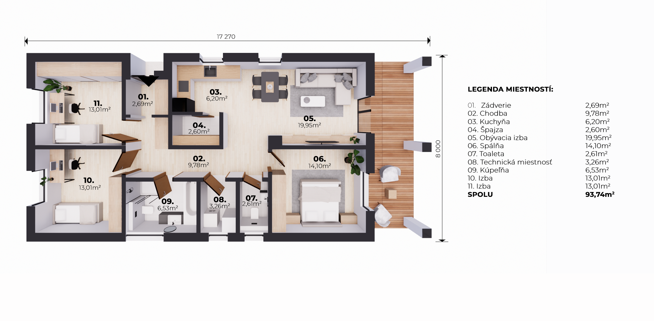 Po vstupe do rodinného domu sa prejdením vstupnej chodby otráva priestor dennej časti domu, pozostávajúci z priestrannej obývačkovej časti, spojenej s kuchyňou a jedálenskou časťou, ktorá poskytuje dostatok miesta na každodenné aktivity a príjemné trávenie spoločného voľného času. Predná časť domu je tvorená ako nočná časť a pozostáva z 2 spální, ktoré sú vhodné najmä ako detské izby, prípadne ako pracovňa, či kreatívna miestnosť. Na chobre prepájajúcej celý dom nájdeme vstupy do samostatne stojaceho WC, kúpelne, a technickej miestnosti. Zadná časť domu s pohľadom na terasu a záhradu sa otvára zo spálne a obývačkovej časti. Na terase je zas dostatok miesta na poobednejší odpočinok v príjemnom polotieni, ktorý poskytuje zastrešenie terasy.